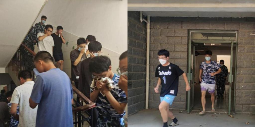演练开始前,学生公寓管理员对紧急疏散逃生等消防知识进行了详细的讲解。随后,按照预定方案,各楼层志愿者在中间阳台点燃灭蚊片,楼道间产生烟雾,演练开始。志愿者在发现火情后立即告知楼栋工作人员,确认火情后楼栋工作人员立即拉响警报器,关闭所有大门电源,并使用喊话器通告发生火险。听到警报后,师生在楼栋工作人员和志愿者的引导下,按照预定路线,用湿毛巾或袖口捂着口鼻,弯着腰,沿着墙壁迅速有效地进行紧急疏散。全体人员撤离到安全区域后,演练结束。